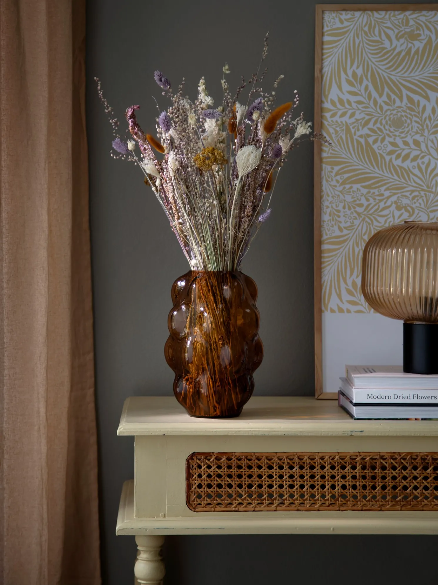 Der Flora-Strauß von Mots More besteht zu 100 % aus natürlichen Trockenblumen. Die Schwestern weisen darauf hin, dass es sich um ein Naturprodukt handelt, so dass die Farben und die Vielfalt der Blumen je nach Verfügbarkeit variieren können. Sie empfehlen, sie vorsichtig zu behandeln und sie nicht in direktem Sonnenlicht oder zu nahe an Hitze oder in feuchten Räumen wie dem Badezimmer zu platzieren.