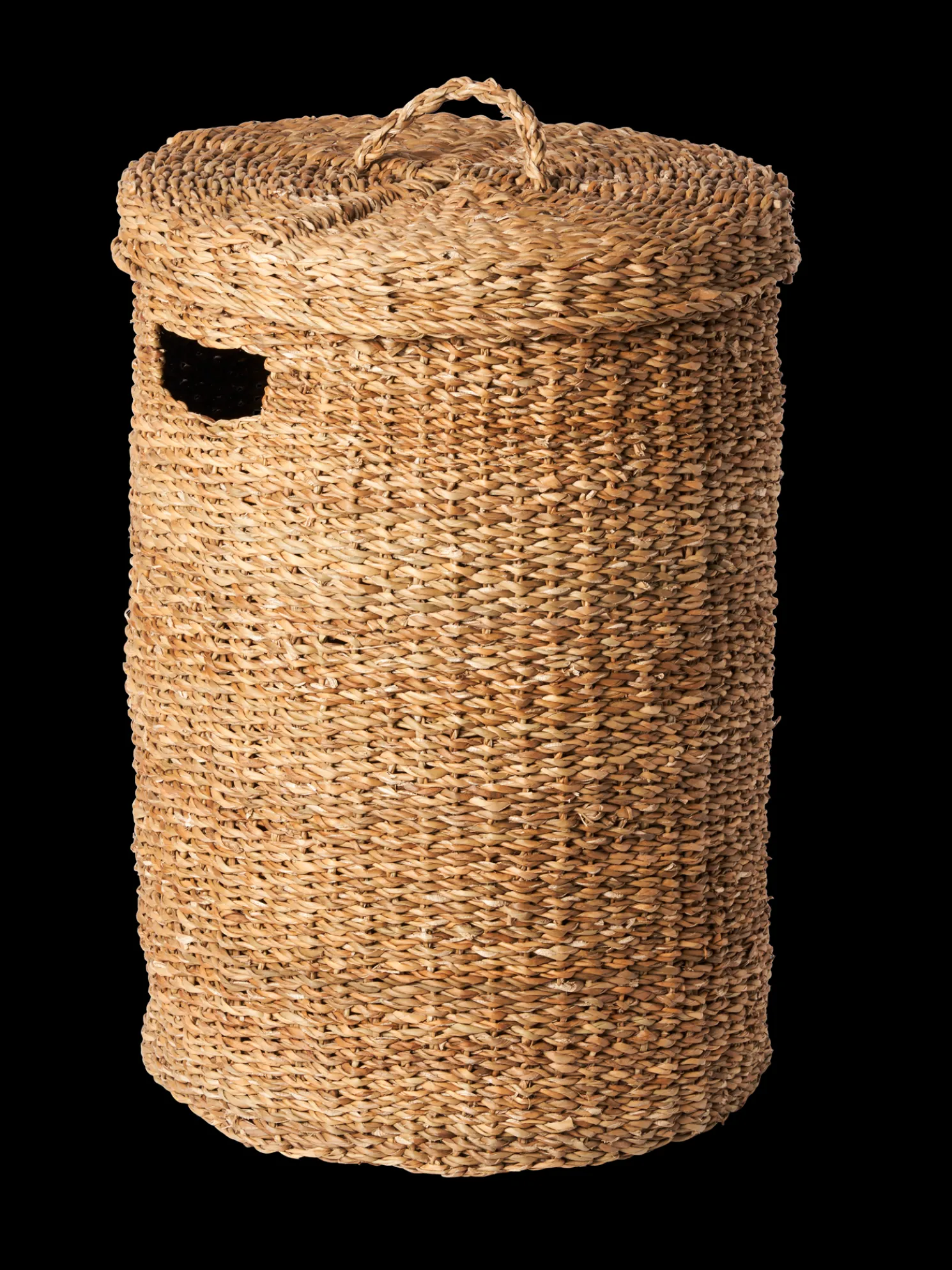 Der Wäschekorb der Schwestern besteht aus Seegras. Er hat einen Durchmesser von 42 cm und misst 60 cm in der Höhe.