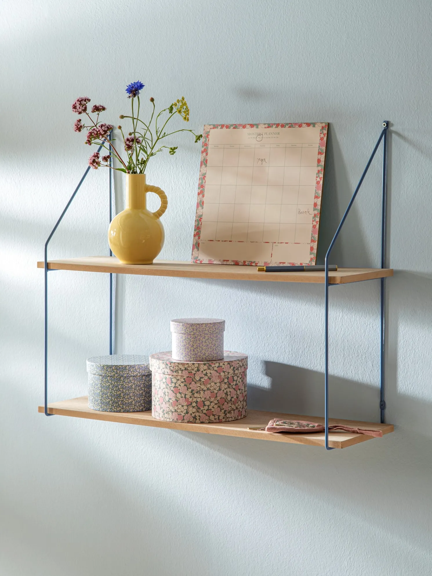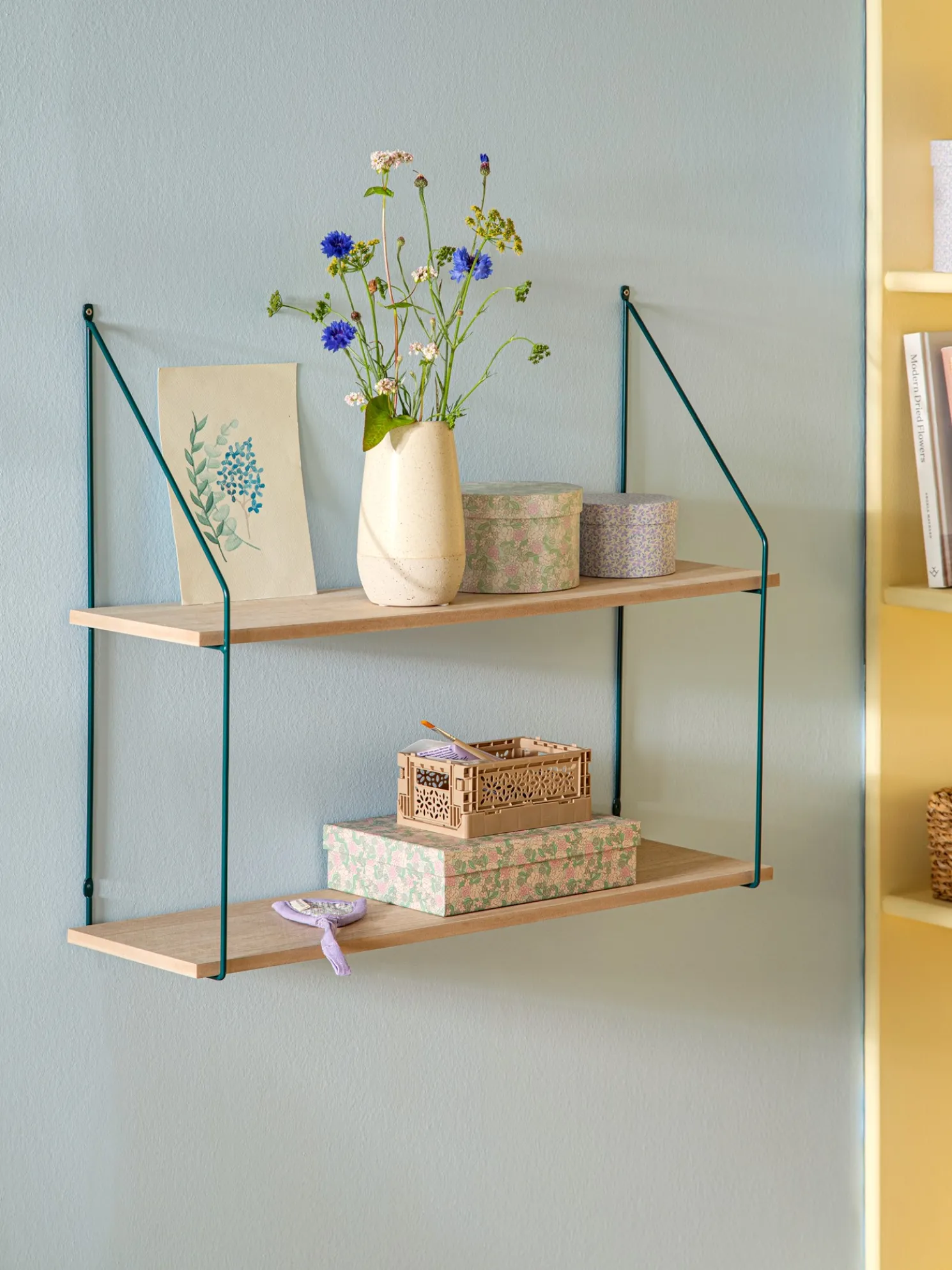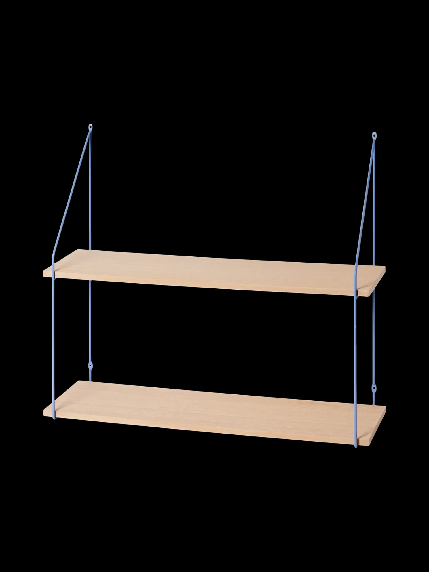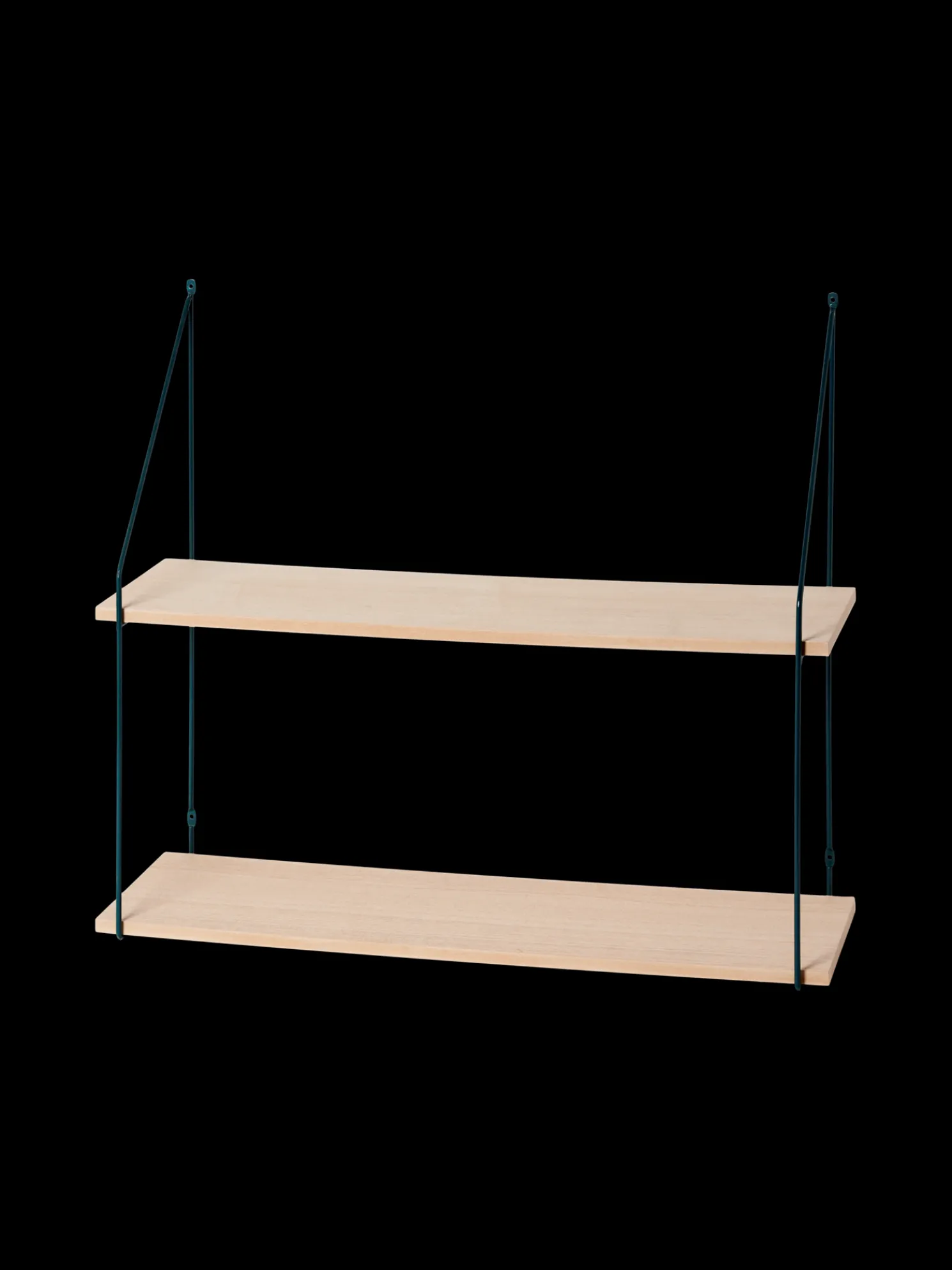 Das Wandregal der Schwestern besteht aus 100 % FSC®-zertifiziertem MDF und Kiefernfurnier. Es hat zwei Regalböden.