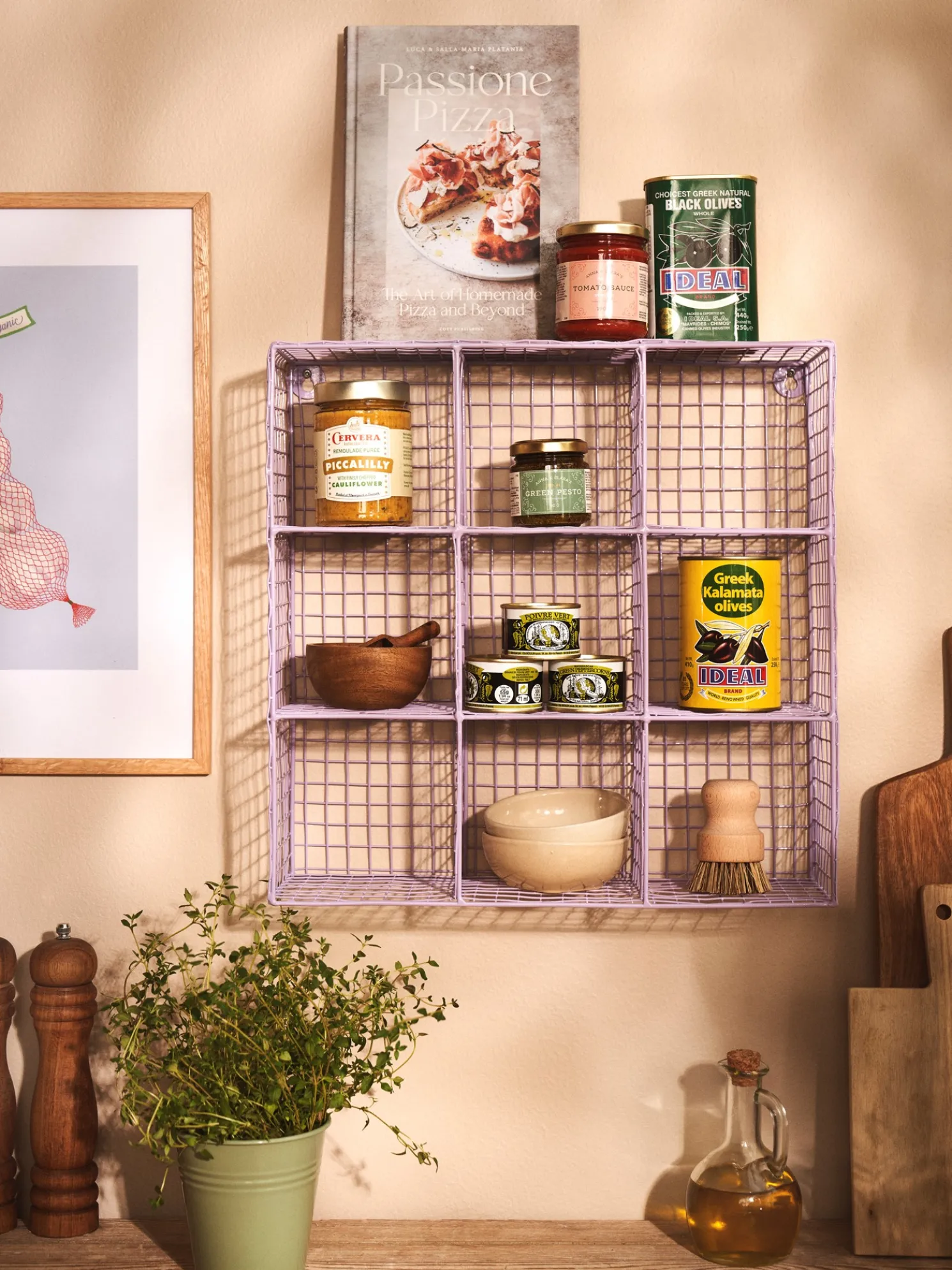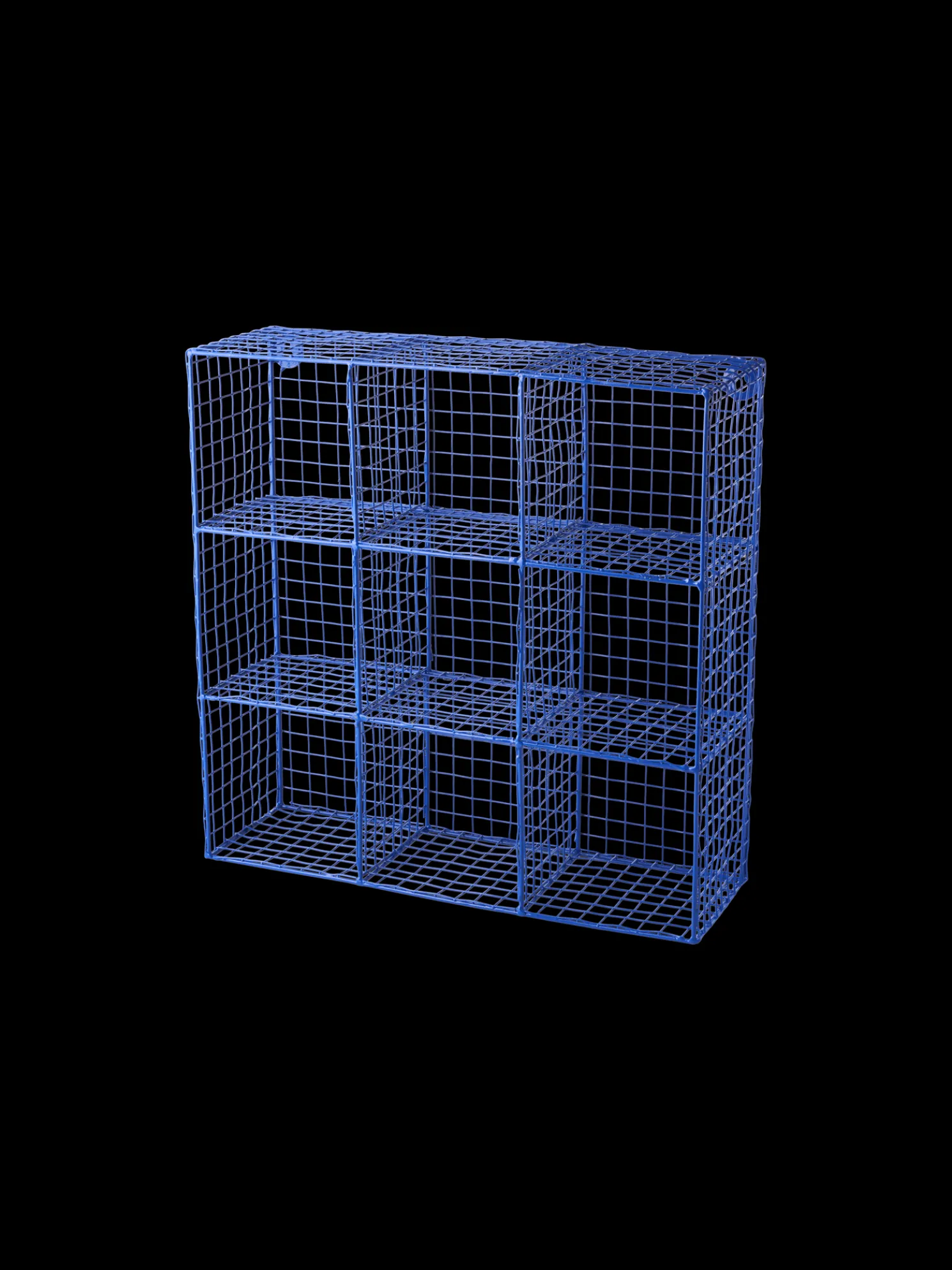 Anna und Claras Wandregal ist aus Eisen gefertigt und misst 39 x 13 x 39 cm. Es hat 9 Fächer.