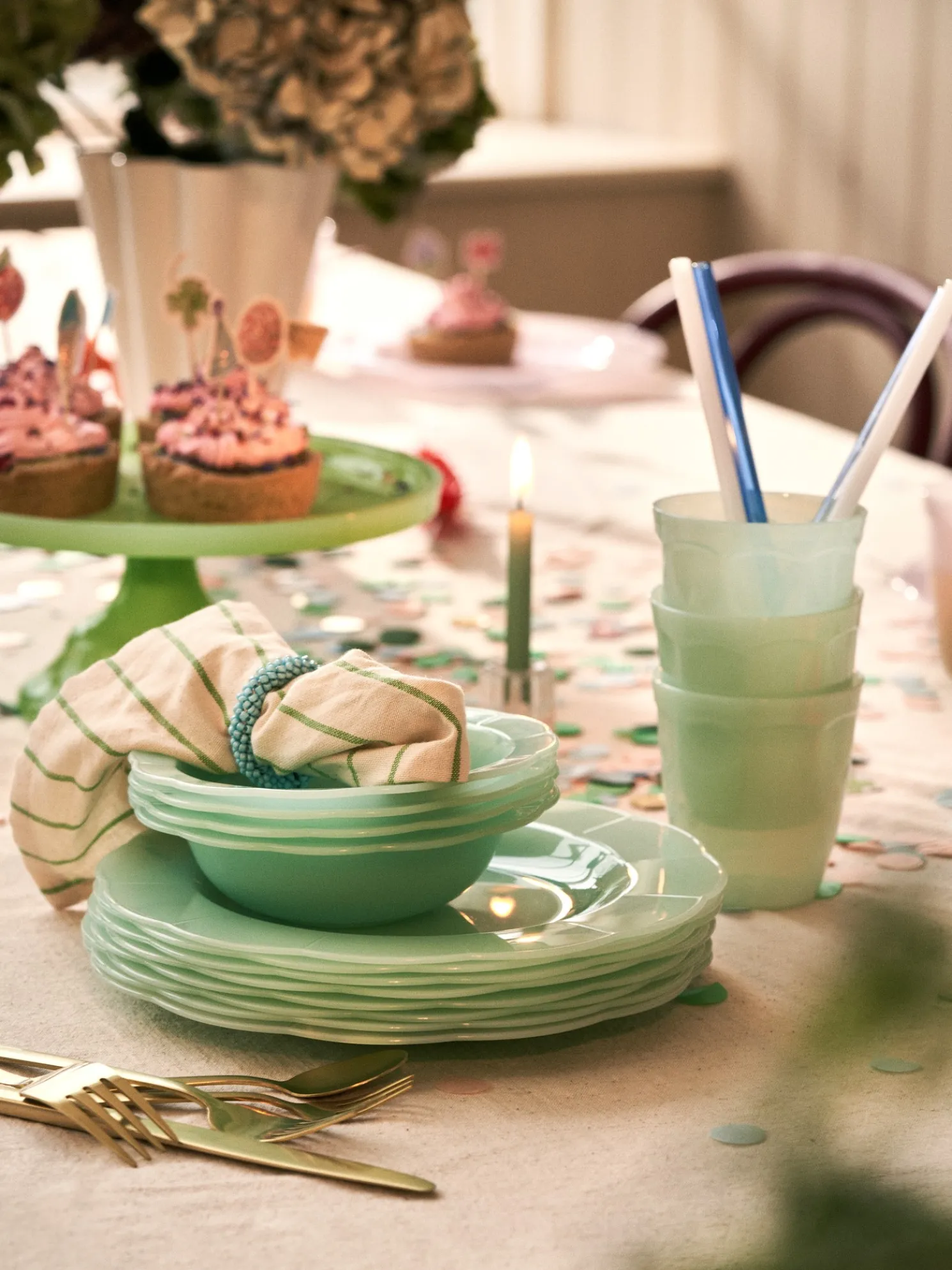 Die Polystyrol-Gläser der Schwestern haben einen Durchmesser von 8,5 cm und können wiederverwendet werden. Eine Packung enthält 4 Gläser. Die Gläser werden in Italien hergestellt.Die Gläser sind Teil unseres Sortiments an Mehrweg-Geschirr – für Picknicks, Strandausflüge und die kleinen und großen Momente des Lebens.Das Mehrwegsortiment dient als Alternative zu Einweg-Papptellern und -bechern, die wir im Rahmen der Verantwortungsstrategie von Søstrene Grene auslaufen lassen. Bei Søstrene Grene arbeiten wir Schritt für Schritt daran, ein Produktsortiment mit möglichst geringen Klimaauswirkungen zu schaffen, und dies ist nur eine unserer vielen Initiativen.Die Schwestern weisen freundlich darauf hin, dass diese Gläser gefrierfest und bis zu 70 Grad spülmaschinenfest sind, aber nicht mikrowellen- oder backofenfest.